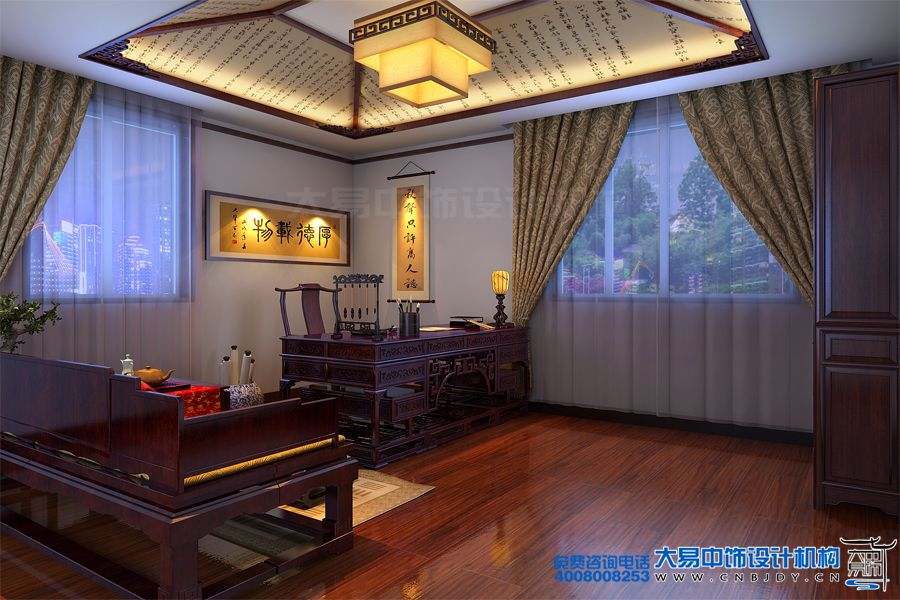 二樓書(shū)房裝修燈光亮麗,中空的藝術(shù)吊頂,造型唯美、溫而雅韻