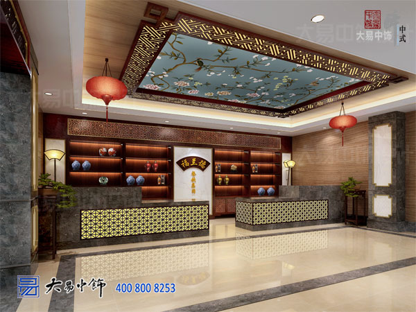 服務(wù)臺立面圍飾選擇畫(huà)作,背景墻是嵌入式木柜,頂部雕花木欄,簡(jiǎn)單框飾,古韻凸顯。