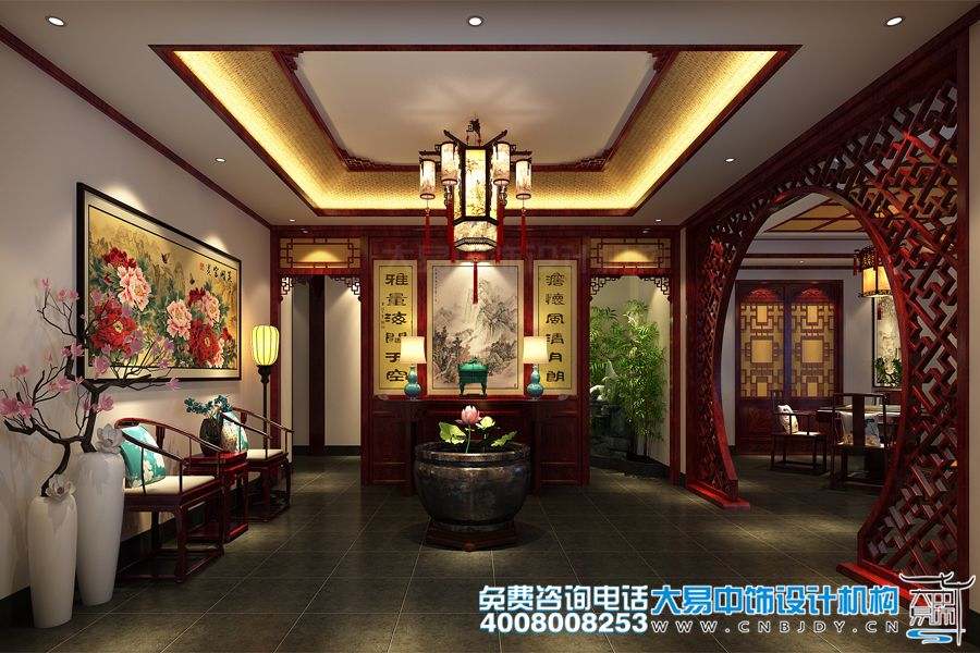 此案例本是餐飲會(huì )所中式設計裝修,所以就餐區的裝飾就更為重要。圖中雅間背景墻懸掛“梅蘭竹菊”四君子畫(huà)幅,彰顯名士清流的高貴品格,淡泊名利的人格品性。又以金色祥云圖案為底色,傳達中國傳統符號的特色韻味,吉祥美滿(mǎn)、和諧共生。圓形吊頂更是以牡丹圖為飾,圓形宮燈流蘇低垂,與圓形餐桌相互輝映,團團圓圓,和和美美,整體烘托的古風(fēng)雅韻、色感優(yōu)美,展示出中式裝飾的富麗與華美。