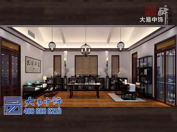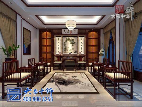 禪修別墅中堂中式設計裝修,簡(jiǎn)約木欄吊頂讓頂部空間在方圓之中渾然一體,正堂背景以?huà)飚?huà)、木屏為飾,以條案置放香鼎、坐屏,映入眼簾的是濃濃的傳統中式氣息。左右兩列圈椅依次排開(kāi),紅木家具與白瓷地板以及淺黃色地毯搭配相襯,以顯和諧靜雅之風(fēng)。落地窗搭配素色帷幔,與百葉狀的竹簾相宜,古樸自然。