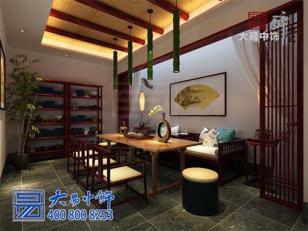 最吸引人眼球的,還是懸于空中的竹節吊燈,青翠欲滴,低垂下來(lái)別樣動(dòng)人。竹的氣節,竹的空靈,與茶室的禪風(fēng)互為映照,相得益彰。