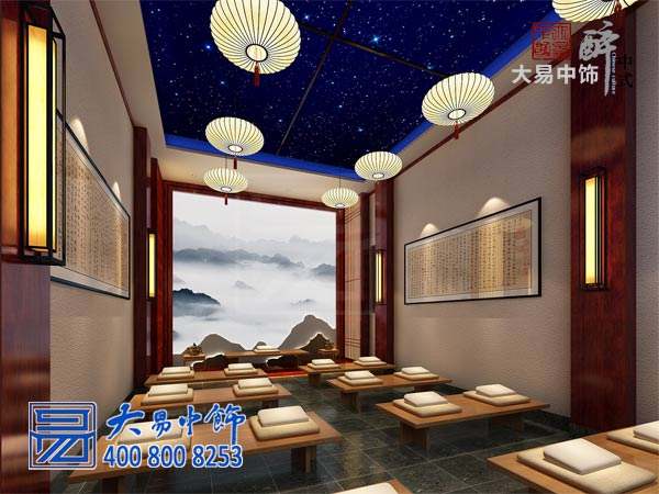 負一層禪堂是此禪修別墅的主場(chǎng)地。因是禪修所需,一切以修心為上,在外部裝飾終力求簡(jiǎn)潔、明朗、淡雅的色調。墻面有壁燈為飾,懸以巨幅佛經(jīng)書(shū)法作品。整體墻面以底色白色為主。正堂為巨幅山巒水墨丹青,遼闊高遠,溢于畫(huà)外。
