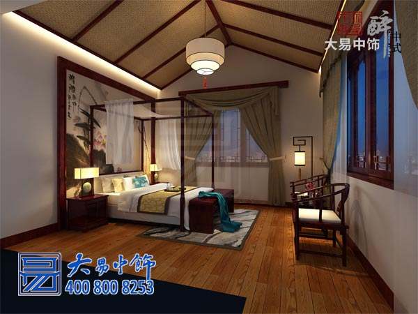 禪修別墅中式設計裝修,臥室采用人字形吊頂,宮燈高懸,映照出室內的樸素質(zhì)感。