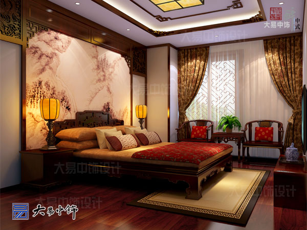 三室兩廳別墅中式裝修主臥室的窗戶(hù)旁,做了個(gè)飄窗柜,增加點(diǎn)臥室收納地方之余,晚上有空還可以坐在窗邊看看夜景。