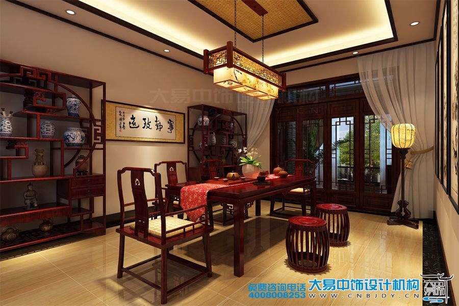 住宅中式設計裝修,書(shū)房的落地窗使得空間光線(xiàn)明亮,采光極好。從窗外望去,更是有一片清幽,不但設計優(yōu)雅,而且整個(gè)環(huán)境在一片靜謐的氛圍之中,讓人居于此能同時(shí)感受到濃郁而舒雅的文化熏陶。室內設一條案,桌旗輕擺,可煮茗待客,或捧書(shū)閑坐,閑適人生,無(wú)比詩(shī)意。