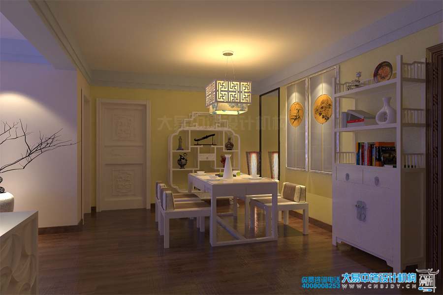 住宅現代中式設計裝修,餐廳設計以白色為主,白色桌椅與原木色地板相搭配,給人以溫暖的質(zhì)感。簡(jiǎn)易博古架豐富著(zhù)淺黃色的墻面,書(shū)柜雙開(kāi)門(mén)上的吉祥扣在細節上透露著(zhù)設計師的小心思,頗具設計感的座椅靠背,既考慮到居家環(huán)境的協(xié)調與實(shí)用性,又極有美觀(guān)度,空間設計使用大面積的留白技法,不僅時(shí)尚創(chuàng )意而且意蘊優(yōu)美。