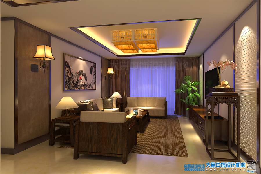 住宅簡(jiǎn)約中式設計裝修,墻面以白色為主,正中懸掛一幅畫(huà)作,無(wú)其他多余裝飾。米黃色花紋地板,在燈光映襯下更顯光潔。棕色實(shí)木家具,造型結構簡(jiǎn)練大方,落地窗以白紗為襯,窗簾俱選擇棕色,整體環(huán)境色調一致,柔和舒適。