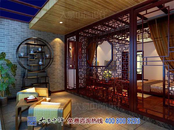 室內方格鏤空隔斷與室內中式燈裝飾相呼應,渾然一體。
