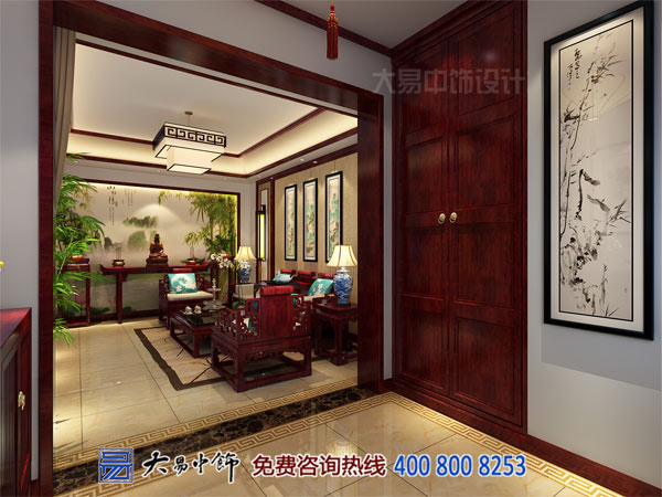過(guò)去人們以為裝飾畫(huà)只能擺在一面墻的正中部,隨著(zhù)現代軟裝設計的發(fā)展,書(shū)畫(huà)的擺放也越來(lái)越多樣化,為了體現隨意和自由,設計師在很多時(shí)候會(huì )傾向于將裝飾畫(huà)布置在角落。在中式裝修居室空間拐角處布置裝飾畫(huà),這一點(diǎn)與現在十分常見(jiàn)的L型沙發(fā)有異曲同工之妙。適當的布置,能夠給人一種舒適的感覺(jué),傳統的居中布置方式,略顯拘束,更適合古典莊重的空間。